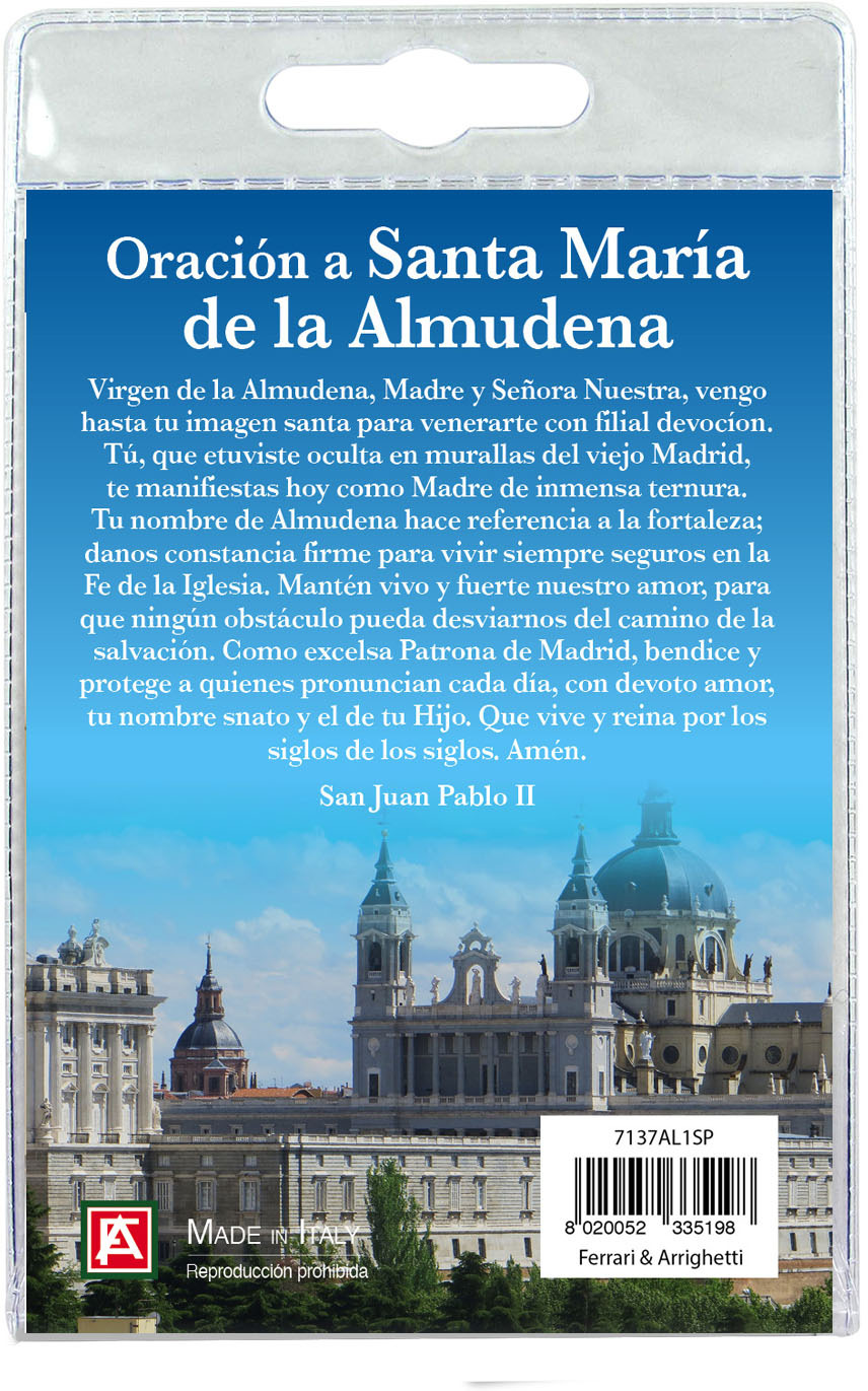 Medaglia Madonna di Almudena di cm 2,5 in metallo nichelato con laccio. L'immagine della Madonna è ricoperta da uno strato di resina trasparente. La medagia si presenta confezionata in un blister con all'interno un cartoncino con immagine della Cattedrale di Almudena e con una preghiera in spagnolo sul retro del cartoncino stesso.