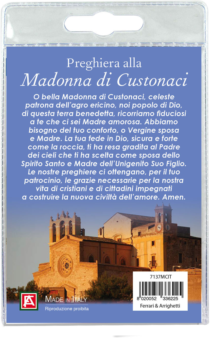 Medaglia di Maria Santissima di Custonaci di cm 2,5 in metallo nichelato con laccio. L'immagine della Madonna è ricoperta da uno strato di resina trasparente. La medaglia si presenta confezionata in un blister con all'interno un cartoncino con immagine della chiesa e con una preghiera in italiano sul retro del cartoncino stesso.