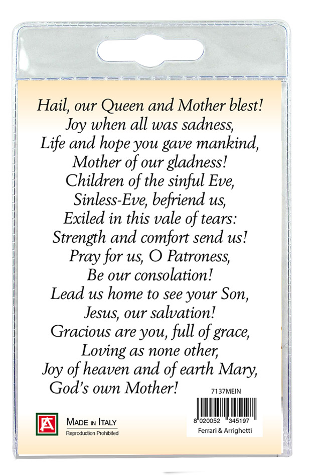 Medaglia della Madonna di Einsiedeln di cm 2,5 in metallo nichelato con laccio. L'immagine della Madonna è ricoperta da uno strato di resina trasparente. La medagia si presenta confezionata in un blister con all'interno un cartoncino con immagine della Madonna e con una preghiera in inglese sul retro del cartoncino stesso.