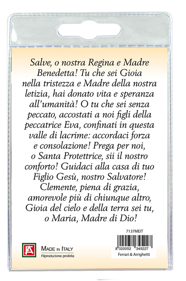 Medaglia della Madonna di Einsiedeln di cm 2,5 in metallo nichelato con laccio. L'immagine della Madonna è ricoperta da uno strato di resina trasparente. La medagia si presenta confezionata in un blister con all'interno un cartoncino con immagine della Madonna e con una preghiera in italiano sul retro del cartoncino stesso.
