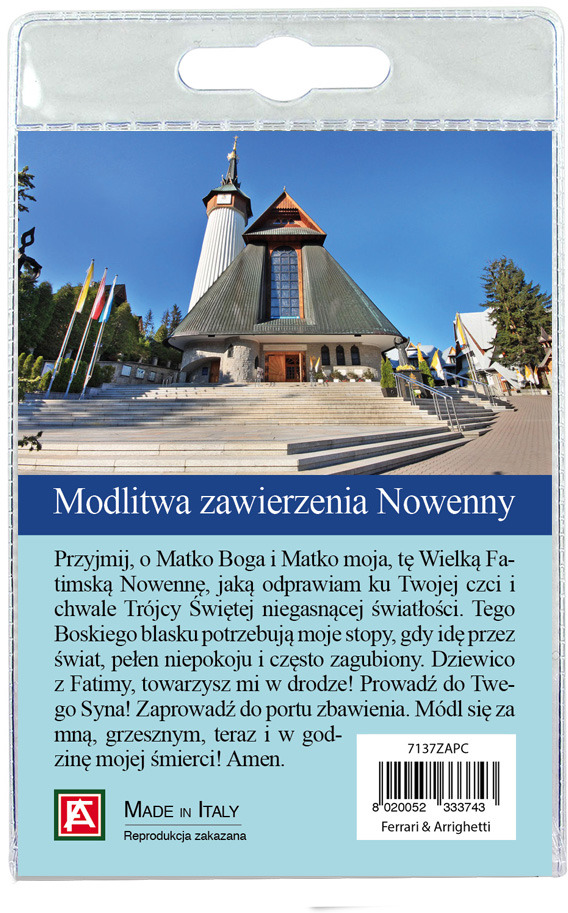 Medaglia Madonna di Fatima di Zakopane di cm 2,5 in metallo nichelato con laccio. L'immagine della Madonna è ricoperta da uno strato di resina trasparente. La medaglia si presenta confezionata in un blister con all'interno un cartoncino con immagine della Madonna e con una preghiera in polacco sul retro del cartoncino stesso.