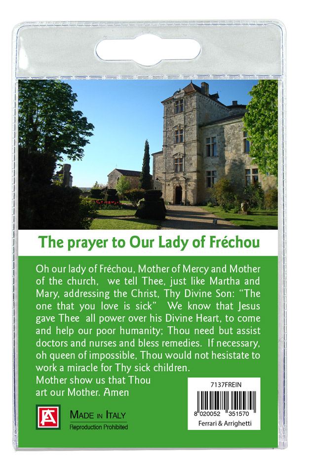 Medaglia della Madonna di Frechou di cm 2,5 in metallo nichelato con laccio. L'immagine della Madonna è ricoperta da uno strato di resina trasparente. La medaglia si presenta confezionata in un blister con all'interno un cartoncino con immagine dell'Apparizione di Fatima e con una preghiera in inglese sul retro del cartoncino stesso.