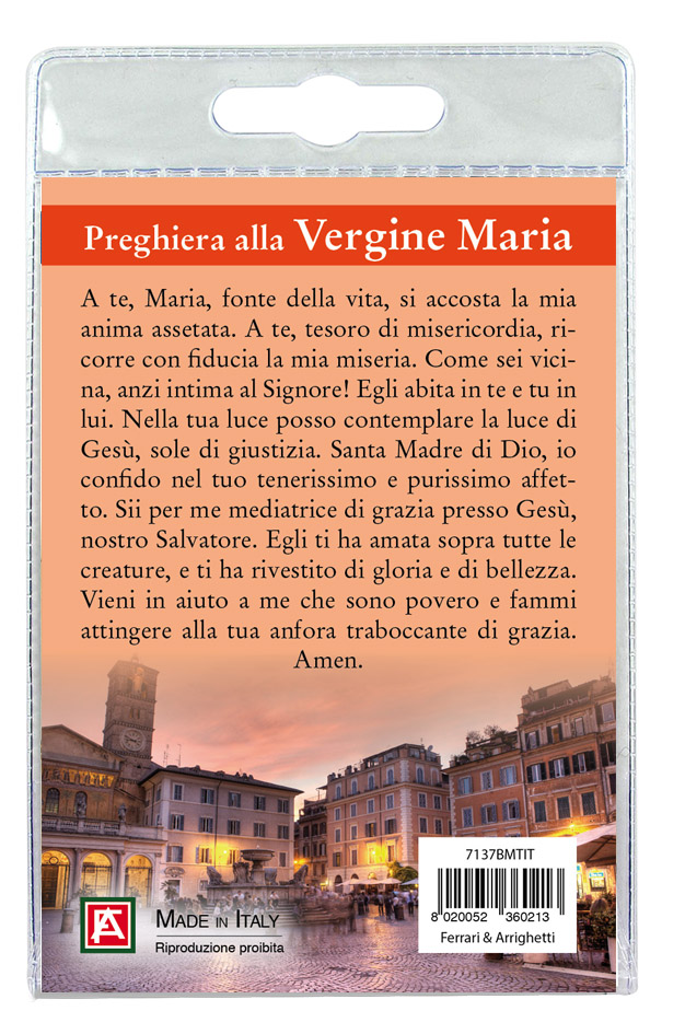 Medaglia Madonna di Santa Maria in Trastevere di cm 2,5 in metallo nichelato con laccio. L'immagine della Madonna è ricoperta da uno strato di resina trasparente. La medaglia si presenta confezionata in un blister con all'interno un cartoncino con immagine della Madonna e con una preghiera in italiano sul retro del cartoncino stesso.