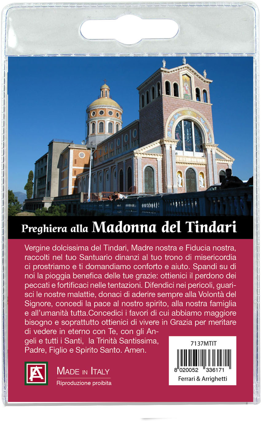 Medaglia della Madonna di Tindari di cm 2,5 in metallo nichelato con laccio. L'immagine della Madonna è ricoperta da uno strato di resina trasparente. La medaglia si presenta confezionata in un blister con all'interno un cartoncino con immagine della Vergine e con una preghiera in italiano sul retro del cartoncino stesso.