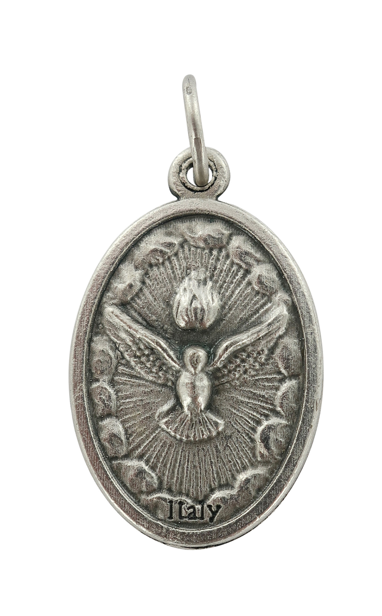 Medaglia ovale in metallo ossidato raffigurante la Sacra Famiglia da un lato e la Colomba che rappresenta lo Spirito Santo dall'altra. Misura: 2,5 x 1,5 cm.