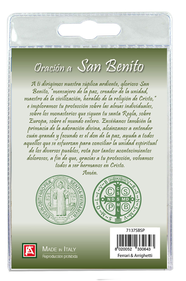 Medaglia di San Benedetto di cm 2,5 in metallo nichelato con laccio. L'immagine del Santo è ricoperta da uno strato di resina trasparente. La medagia si presenta confezionata in un blister con all'interno un cartoncino con immagine del Santo e con una preghiera in spagnolo sul retro del cartoncino stesso.