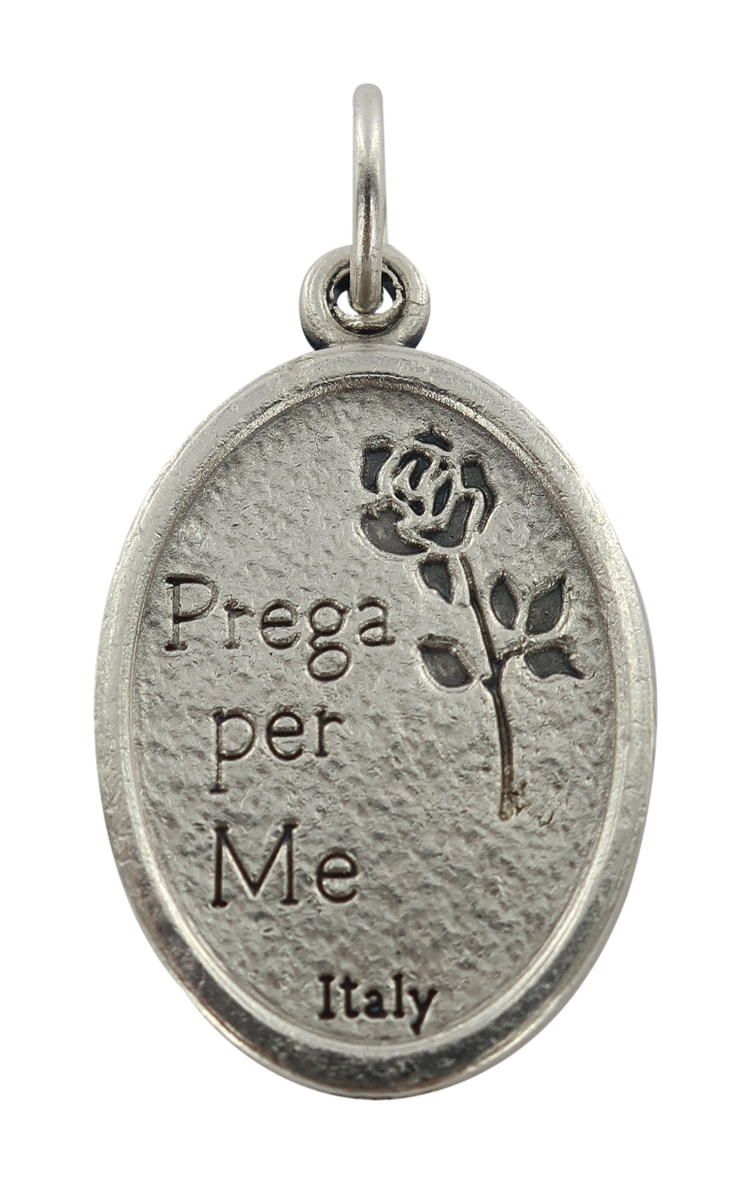 Medaglia ovale in metallo ossidato da 20 mm raffigurante San Cristoforo. Il prodotto ha la figura in rilievo ed è molto precisa nei particolari. Il retro reca l'incisione "Prega per me" e una rosa.