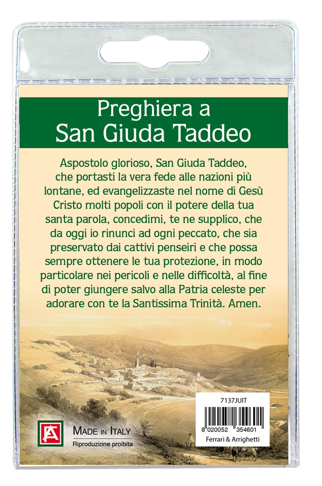 Medaglia di San Giuda Taddeo da cm 2,5 in metallo nichelato con laccio. L'immagine del Santo è ricoperta da uno strato di resina trasparente. La medaglia si presenta confezionata in un blister con all'interno un cartoncino con immagine del Santo e con una preghiera in italiano sul retro del cartoncino stesso.