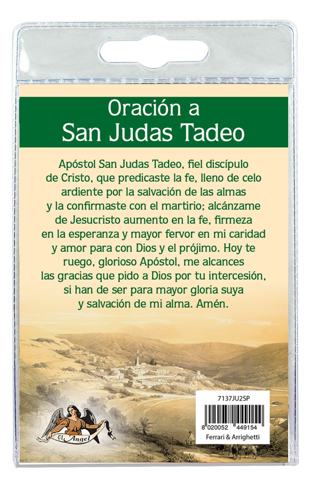 Medaglia San Giuda Taddeo (Madrid) di cm 2,5 in metallo nichelato con laccio. L'immagine del Santo è ricoperta da uno strato di resina trasparente. La medaglia si presenta confezionata in un blister con all'interno un cartoncino con immagine di San Giuda Taddeo e con una preghiera in spagnolo sul retro del cartoncino stesso.