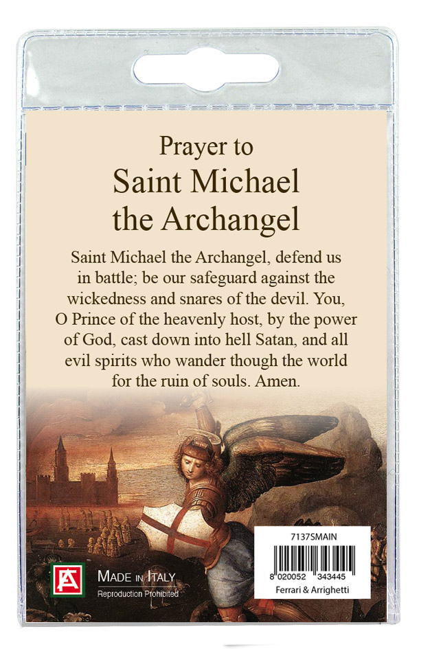 Medaglia di San Michele di cm 2,5 in metallo nichelato con laccio. L'immagine del Santo è ricoperta da uno strato di resina trasparente. La medagia si presenta confezionata in un blister con all'interno un cartoncino con immagine del Santo e con una preghiera in inglese sul retro del cartoncino stesso.