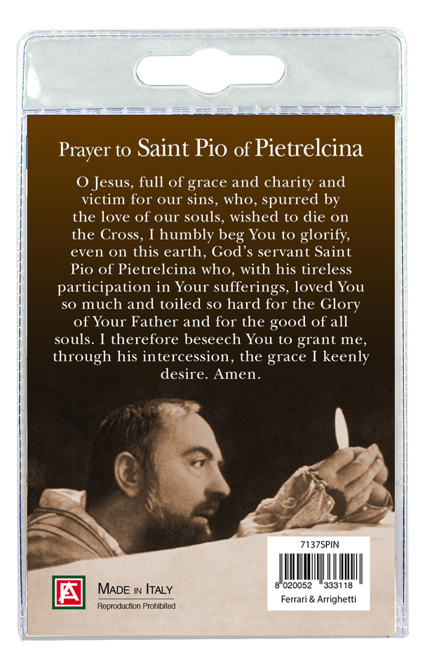 Medaglia San Pio di cm 2,5 in metallo nichelato con laccio. L'immagine del Santo è ricoperta da uno strato di resina trasparente. La medagia si presenta confezionata in un blister con all'interno un cartoncino con immagine del Santo e con una preghiera in inglese sul retro del cartoncino stesso.