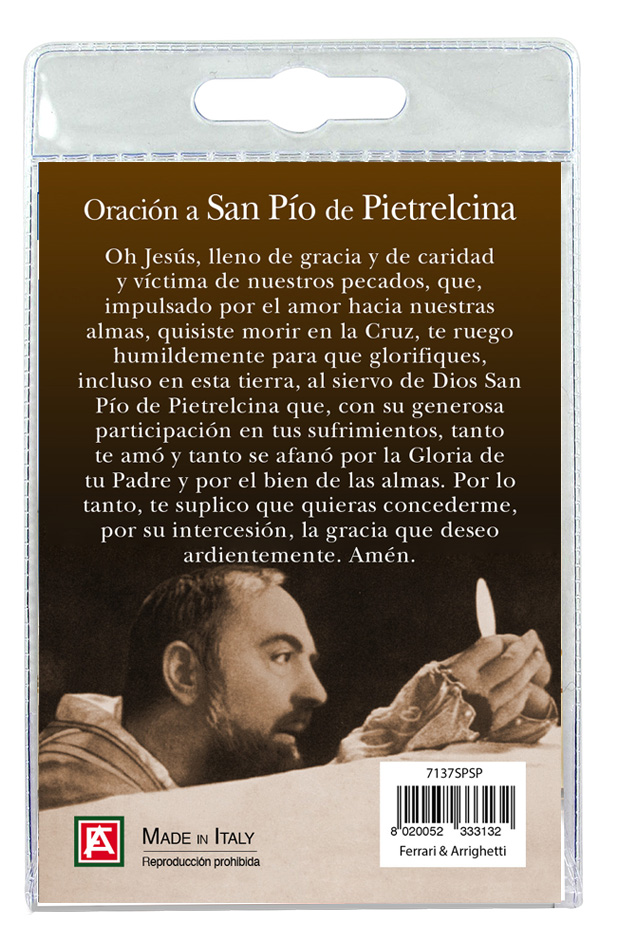 Medaglia San Pio di cm 2,5 in metallo nichelato con laccio. L'immagine del Santo è ricoperta da uno strato di resina trasparente. La medagia si presenta confezionata in un blister con all'interno un cartoncino con immagine del Santo e con una preghiera in spagnolo sul retro del cartoncino stesso. Realizzato in Italia.