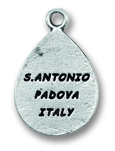 Medaglia di Sant'Antonio a forma di goccia in metallo ossidato.