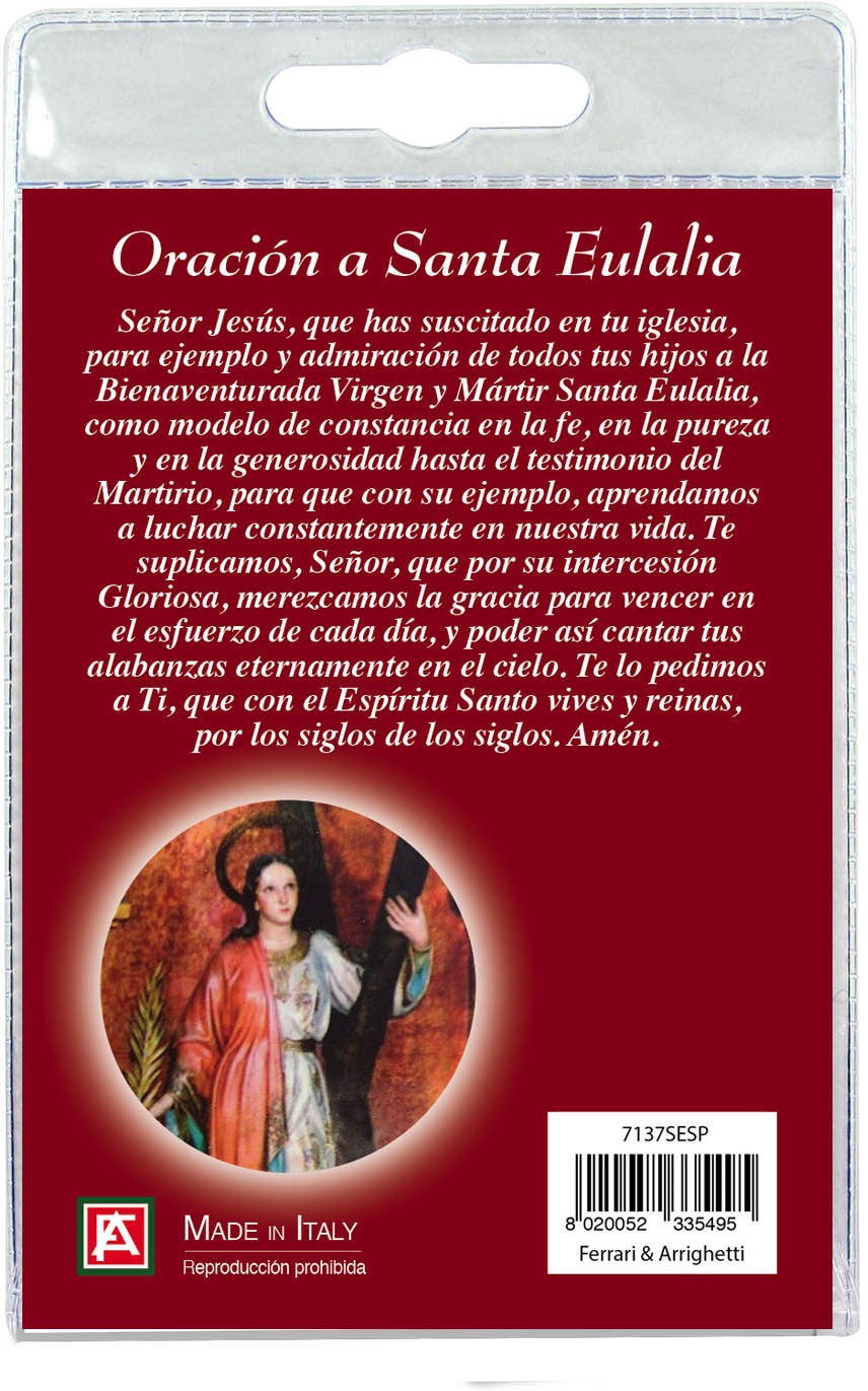 Medaglia Sant'Eulalia di cm 2,5 in metallo nichelato con laccio. L'immagine della Santa è ricoperta da uno strato di resina trasparente. La medagia si presenta confezionata in un blister con all'interno un cartoncino con immagine della Santa e con una preghiera in spagnolo sul retro del cartoncino stesso.