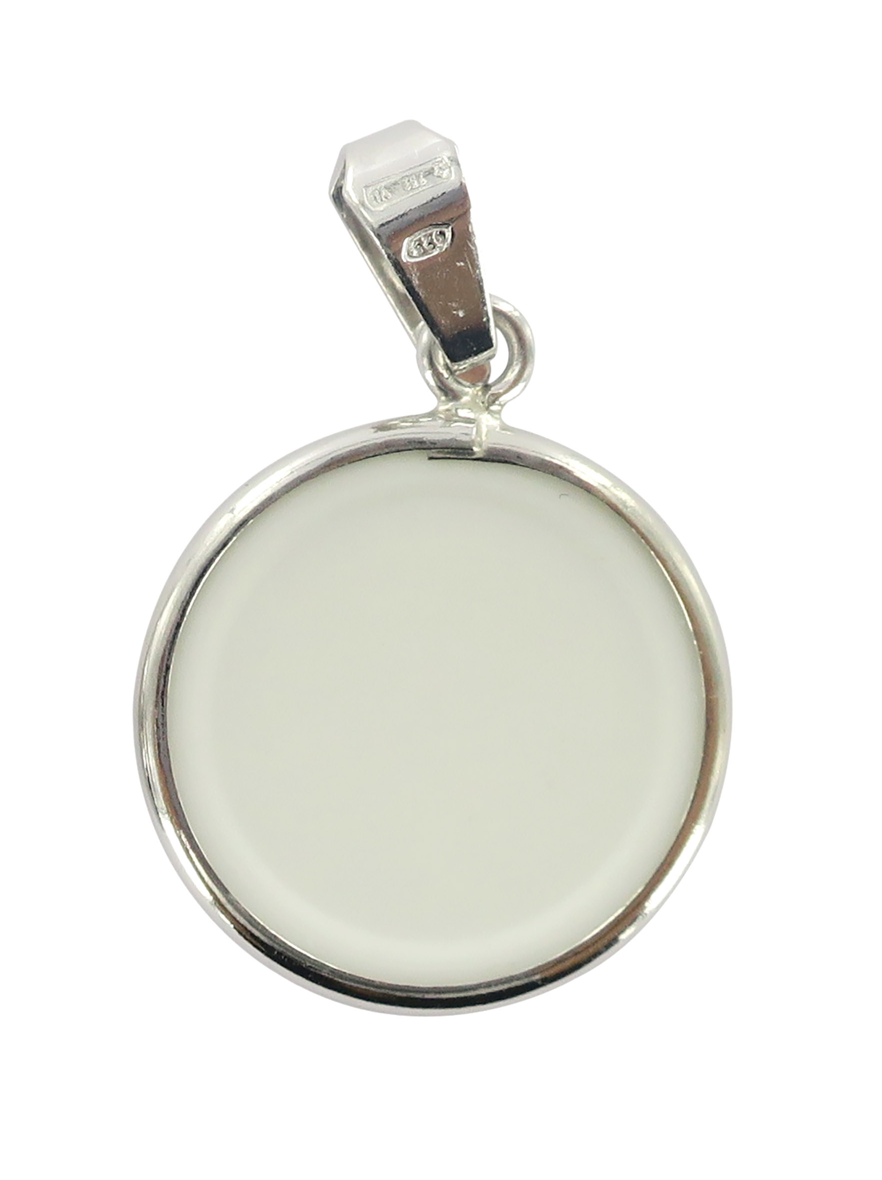 Il bordo in argento 925 incornicia il tutto. Il diametro è di cm 1,8. Il peso è di 1,5 gr. Realizzato in Italia.