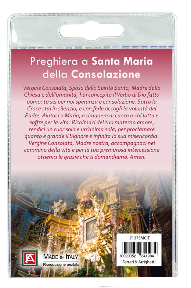 Medaglia di Santa Maria della Consolazione di cm 2,5 in metallo nichelato con laccio. L'immagine della Santa è ricoperta da uno strato di resina trasparente. La medagia si presenta confezionata in un blister con all'interno un cartoncino con immagine di Santa Maria della Consolazione e con una preghiera in italiano sul retro del cartoncino stesso.