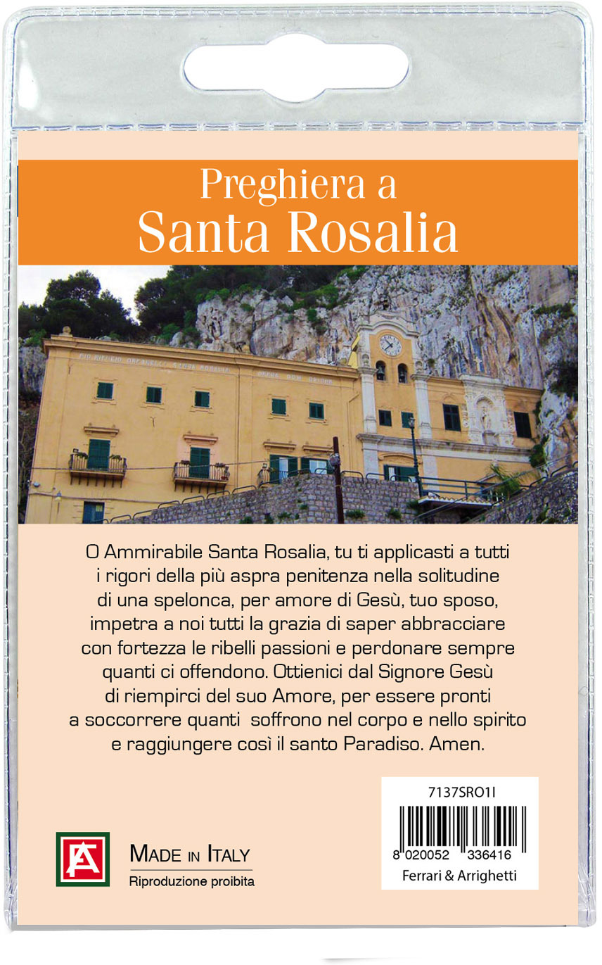Medaglia di Santa Rosalia di cm 2,5 in metallo nichelato con laccio. L'immagine della Santa è ricoperta da uno strato di resina trasparente. La medaglia si presenta confezionata in un blister con all'interno un cartoncino con immagine della Santa e con una preghiera in italiano sul retro del cartoncino stesso.
