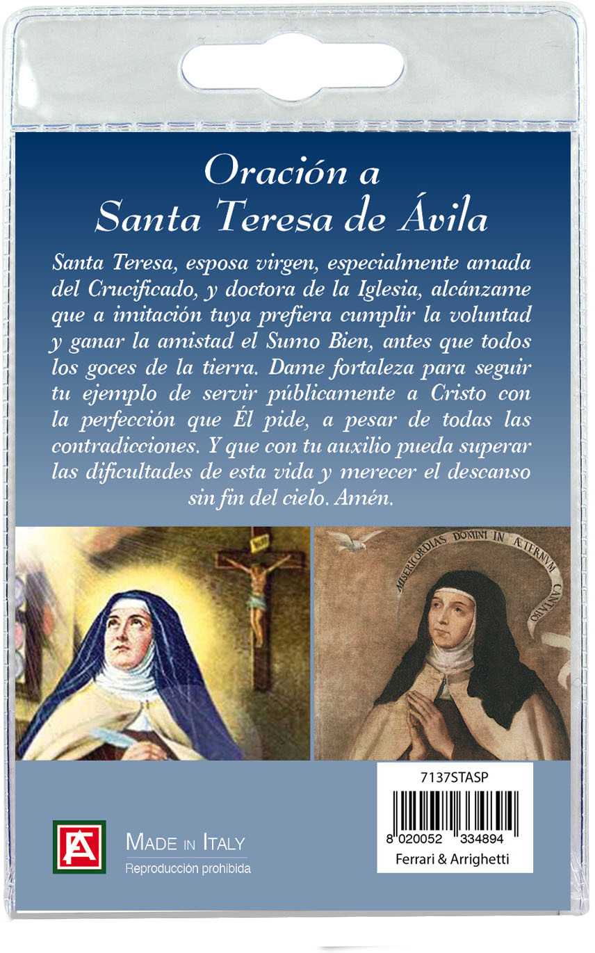 Medaglia Santa Teresa d'Avila di cm 2,5 in metallo nichelato con laccio. L'immagine della Santa è ricoperta da uno strato di resina trasparente. La medagia si presenta confezionata in un blister con all'interno un cartoncino con immagine della Santa e con una preghiera in spagnolo sul retro del cartoncino stesso. Realizzato in Italia.