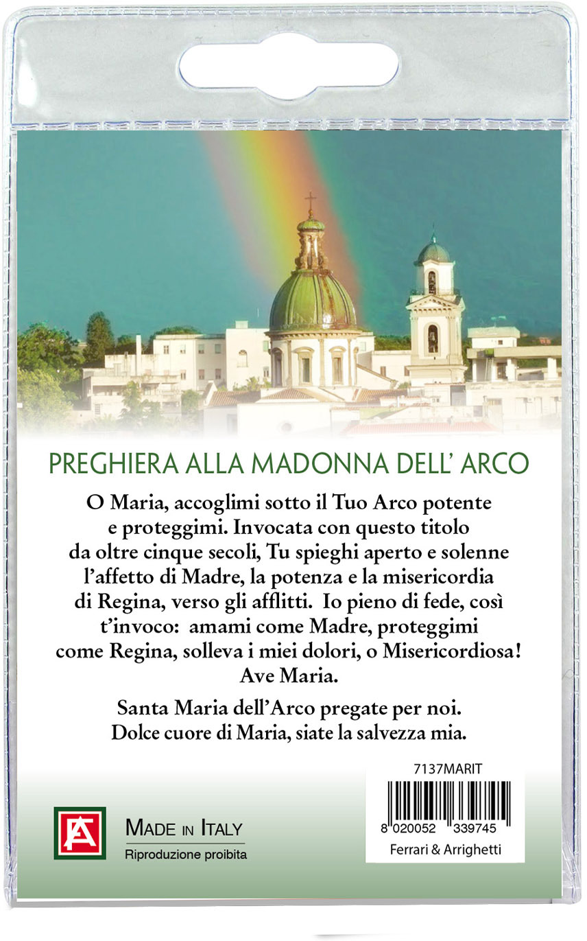 Medaglia della Madonna dell'Arco di cm 2,5 in metallo nichelato con laccio. L'immagine della Madonna è ricoperta da uno strato di resina trasparente. La medaglia si presenta confezionata in un blister con all'interno un cartoncino con immagine della Vergine e con una preghiera in italiano sul retro del cartoncino stesso.