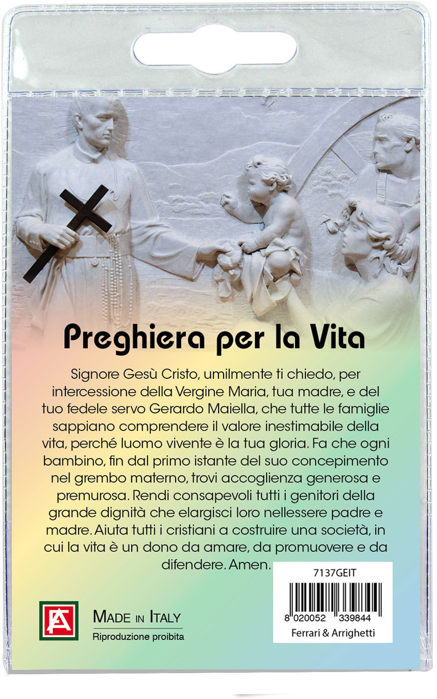 Medaglia di San Gerardo Maiella di cm 2,5 in metallo nichelato con laccio. L'immagine del Santo è ricoperta da uno strato di resina trasparente. La medaglia si presenta confezionata in un blister con all'interno un cartoncino con immagine di San Gerardo Maiella e con una preghiera in italiano sul retro del cartoncino stesso. Realizzato in Italia.