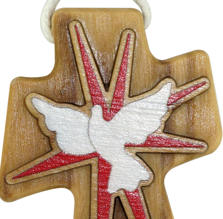 Ricordo della Cresima: croce realizzata in legno di ulivo con colomba in rilievo e fornita con cordoncino bianco.