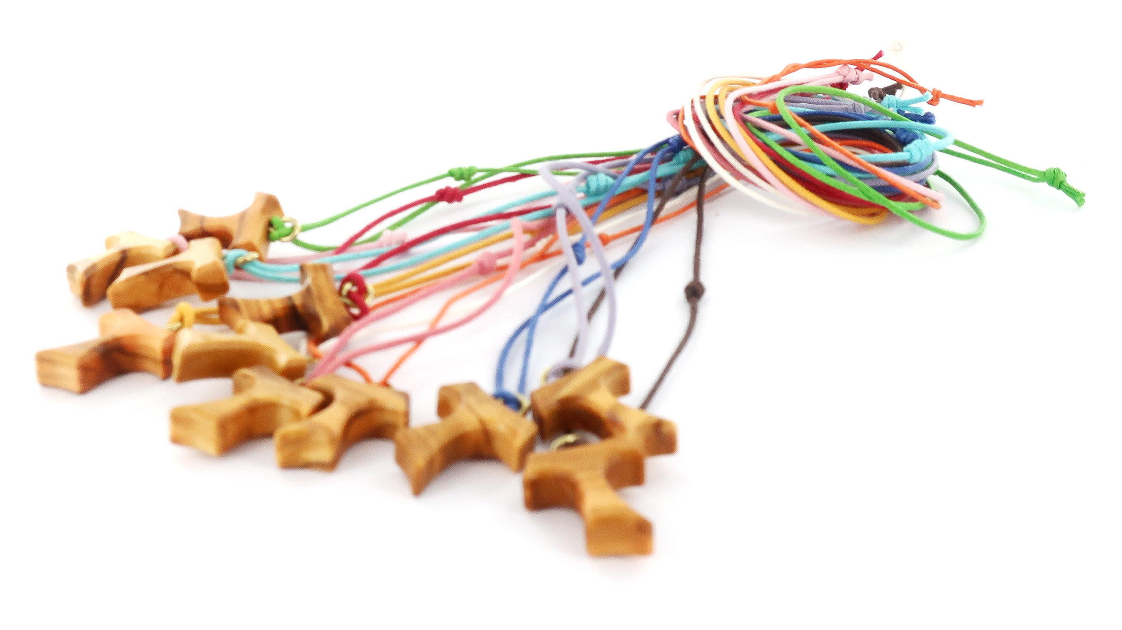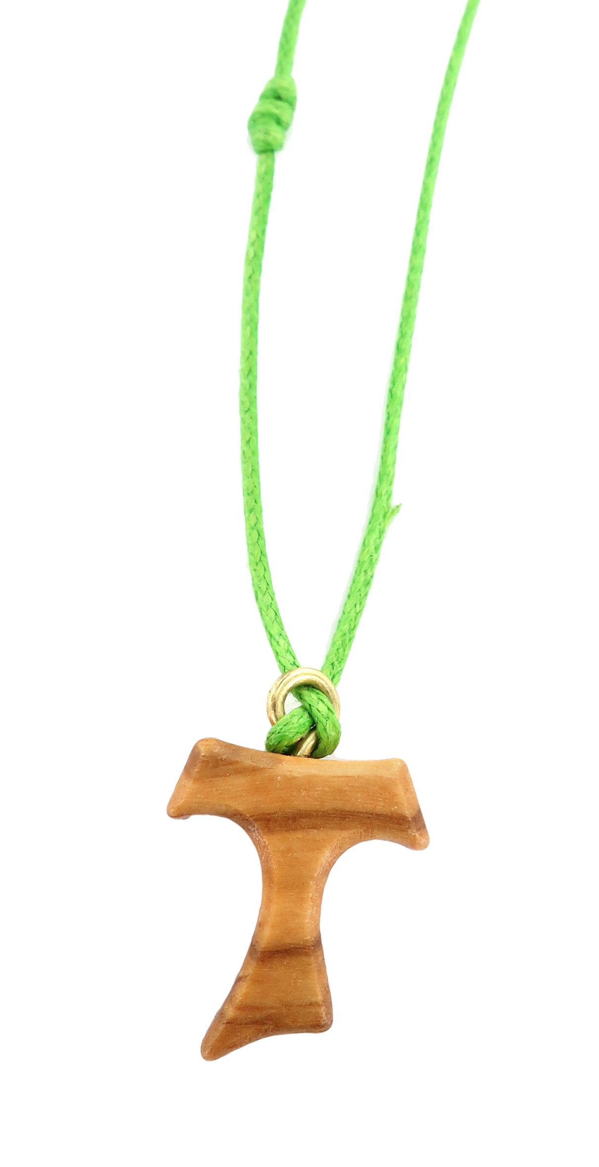 Croce tau pendente alta 1,5 cm (2 cm con gancettino) e larga 1,2 cm, in legno ulivo. Con laccio colorato.