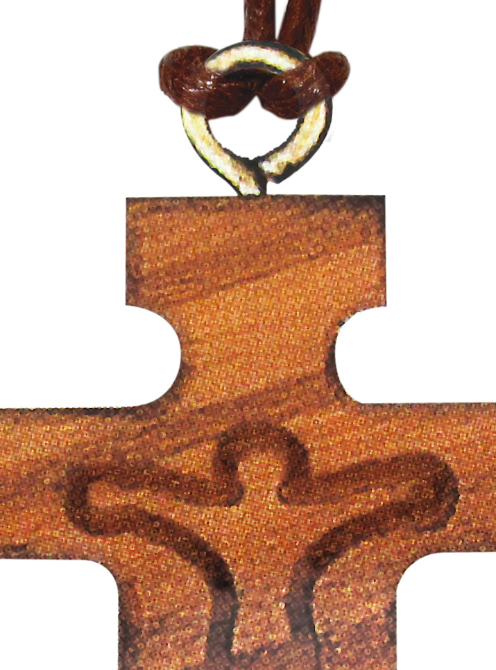 Croce in legno d'ulivo raffigurante il corpo di Cristo inciso.