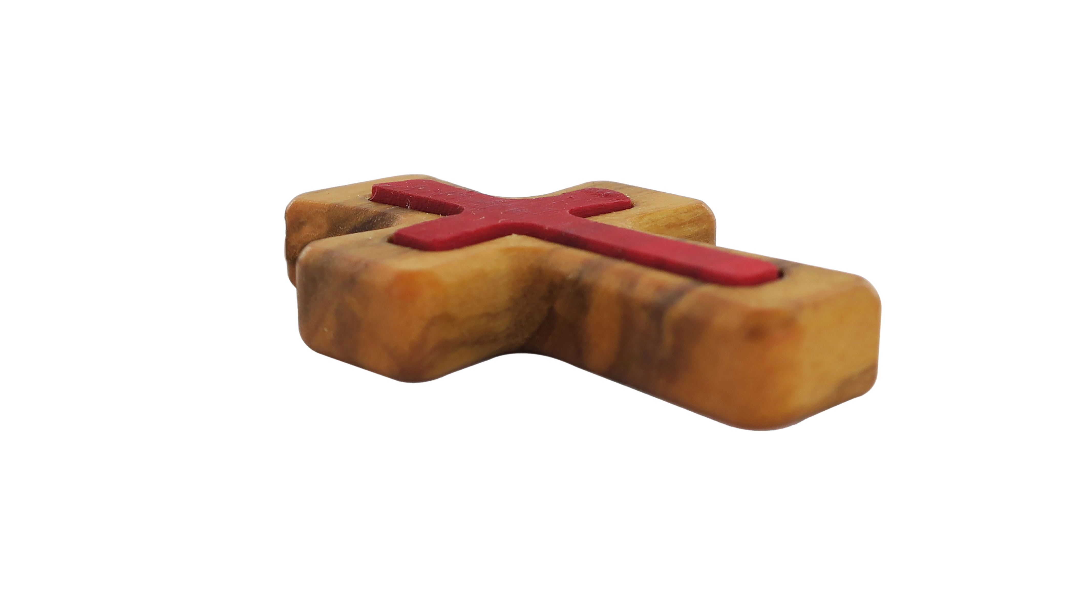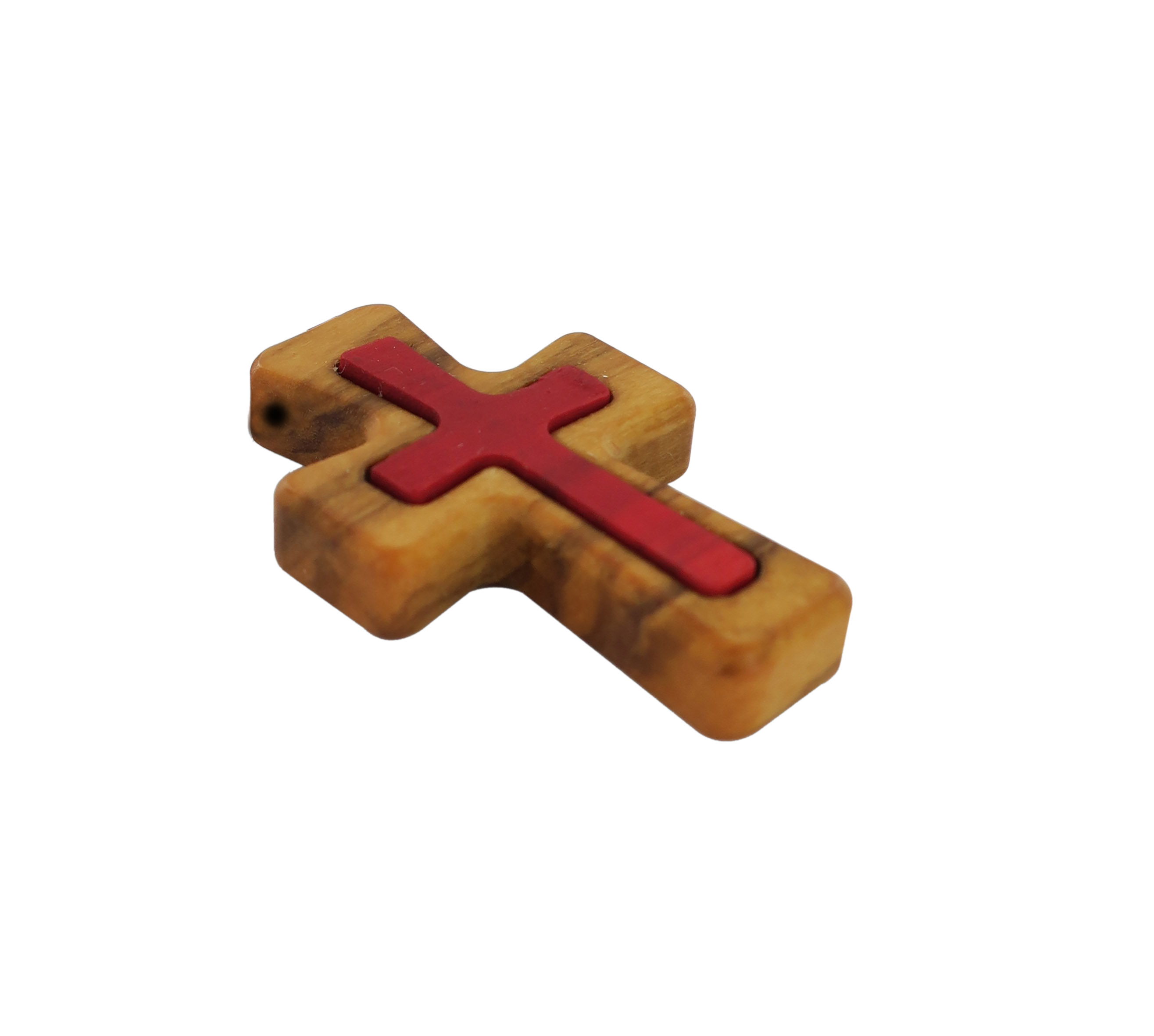 Croce in legno di ulivo con cordone in stoffa marrone.