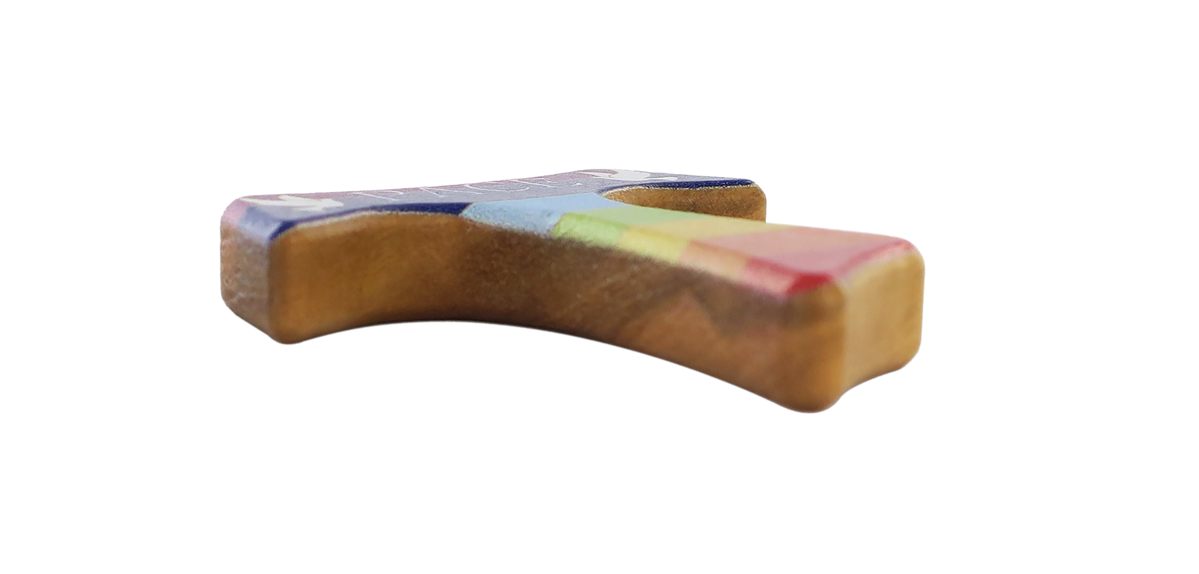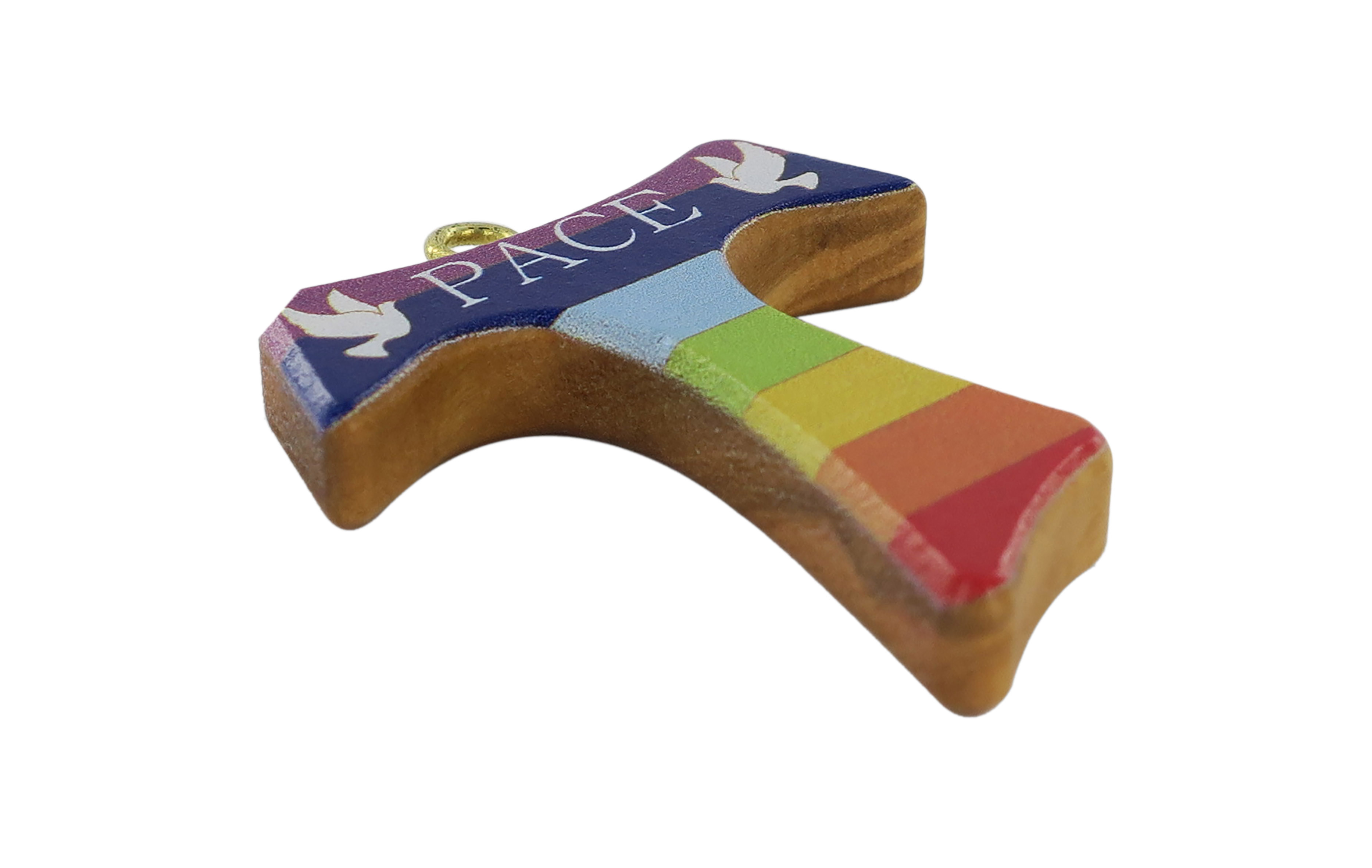 Croce Tau di San Francesco d'Assisi in legno d'ulivo dipinta con i colori che ricordano l'arcobaleno.