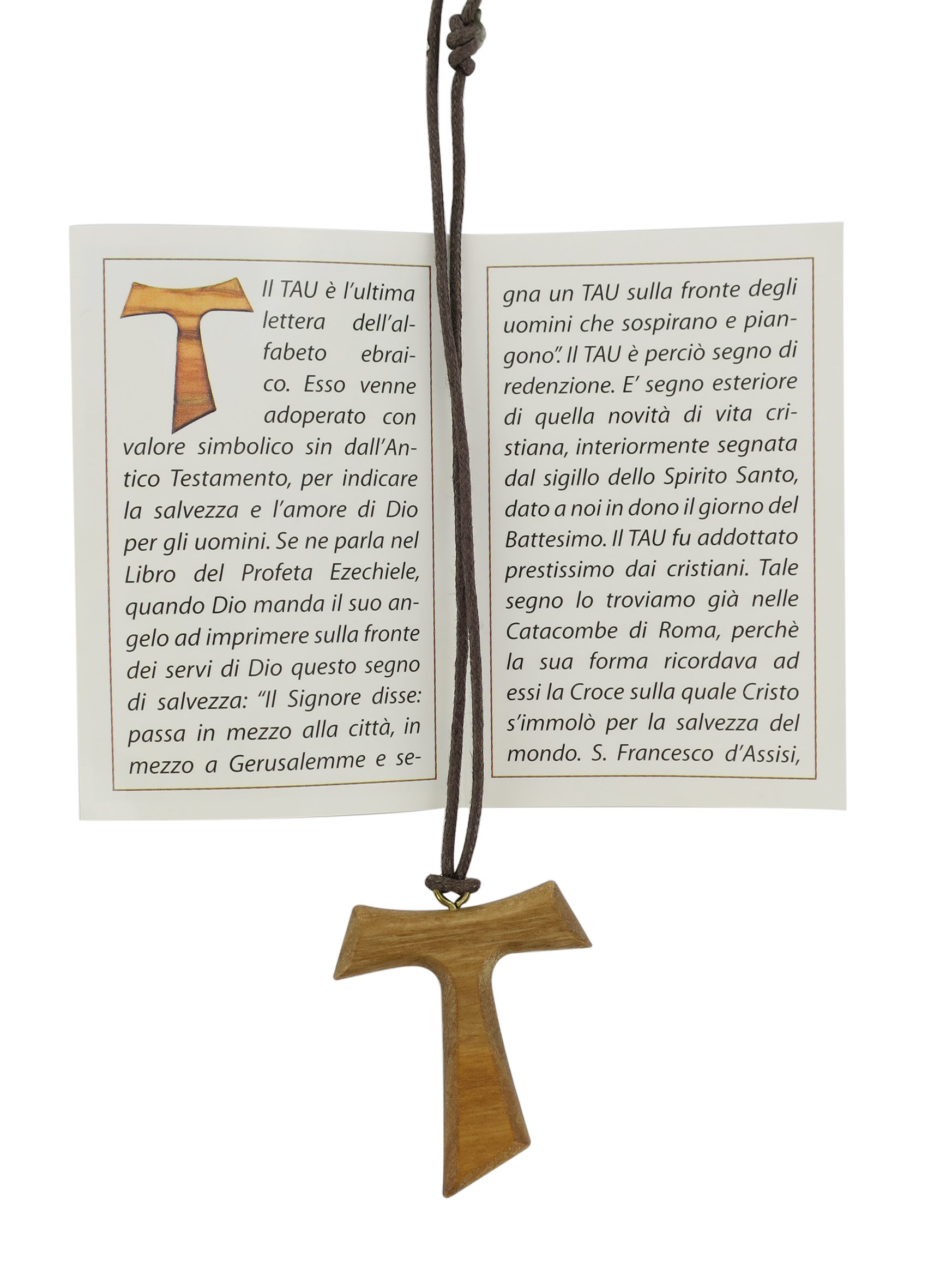 Croce Tau di San Francesco d'Assisi in legno d'ulivo con preghiera.