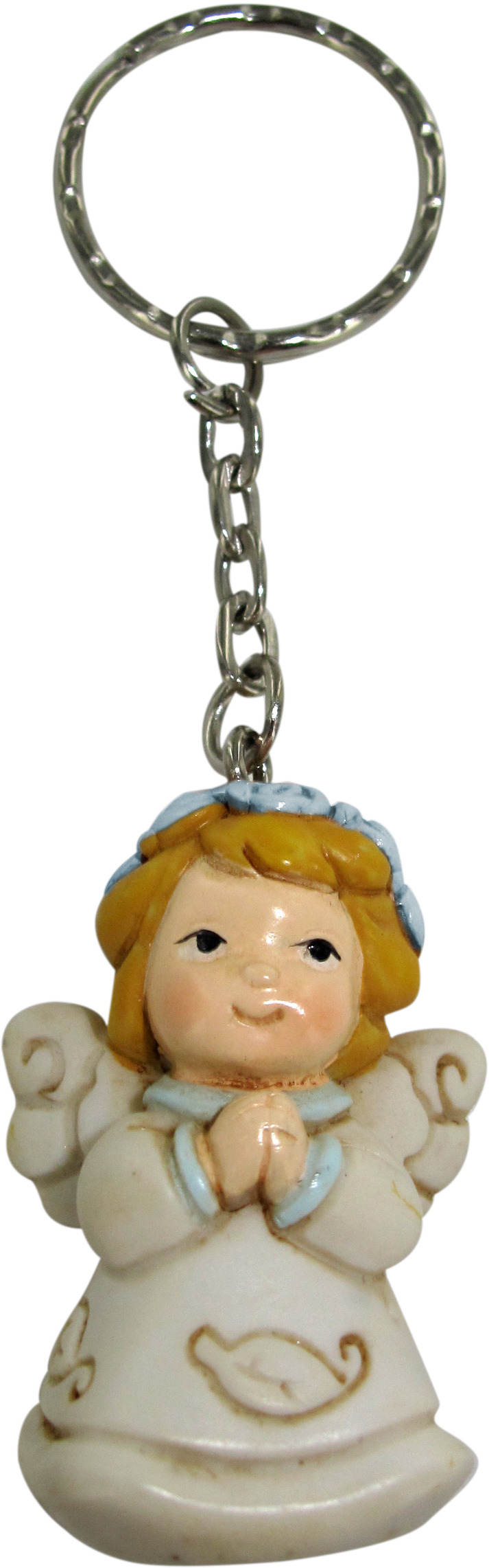 Portachiavi raffigurante un angelo che prega, con dettagli color azzurro (adatto a un bambino). Altezza: 4 cm. Idea regalo perfetta per bambini del catechismo.