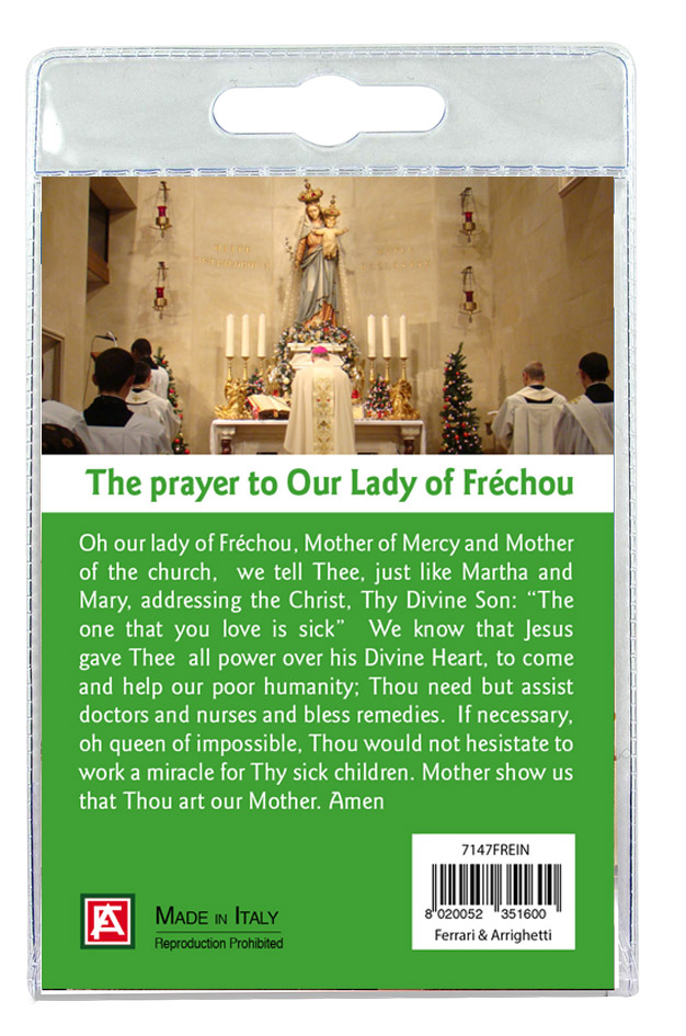 Il blister si presenta con all'interno un cartoncino, rappresentante la Madonna di Frechou.