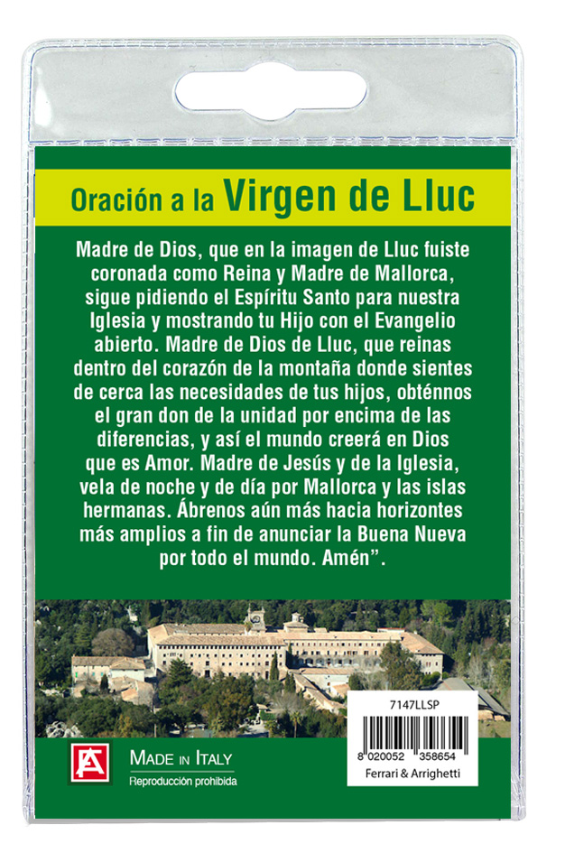Sul retro del cartoncino vi è stampata l'immagine di Madonna di Lluc.
