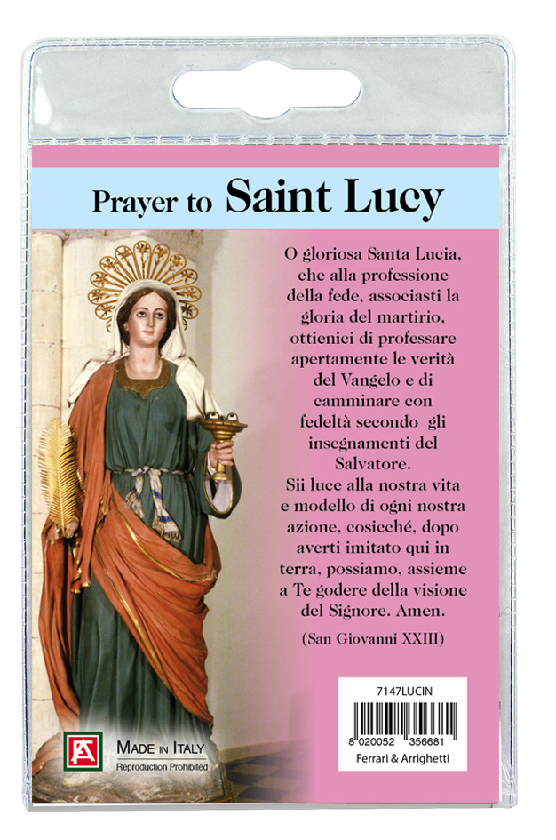 Il blister si presenta con all'interno un cartoncino, rappresentante Santa Lucia.