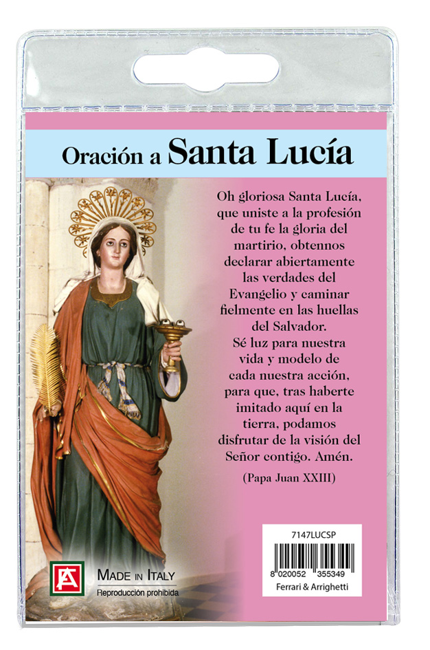 Il blister si presenta con all'interno un cartoncino, rappresentante Santa Lucia.