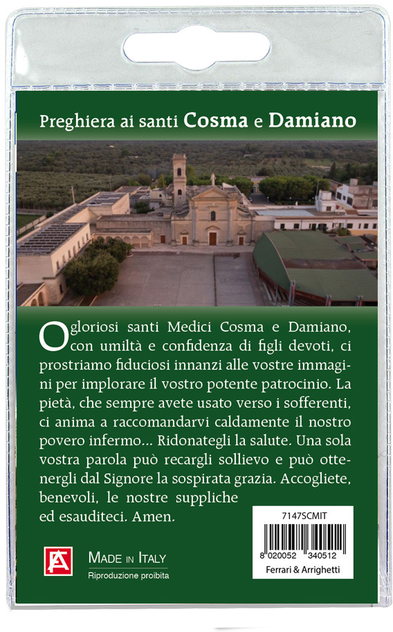 Il blister si presenta con all'interno un cartoncino, rappresentante S. Cosma e Damiano (ad Oria)