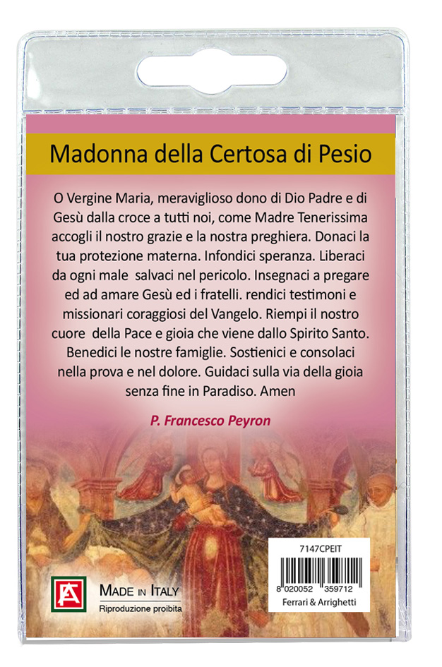 Sul retro del cartoncino vi è stampata l'immagine della Madonna della Certosa di Pesio ed una preghiera a lei dedicata.