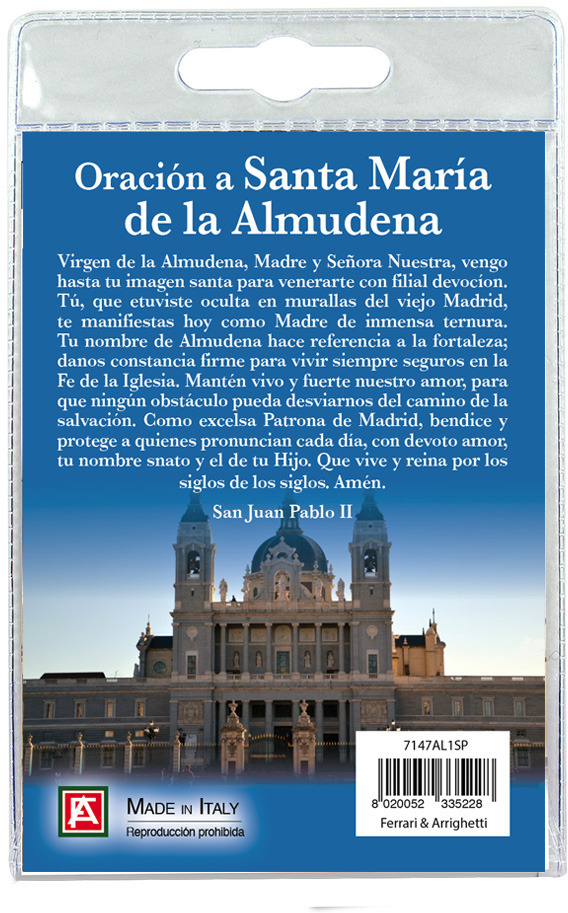 Il Portachiavi si presenta confezionata in un blister con all'interno un cartoncino con immagine della Cattedrale di Almudena e con una preghiera in spagnolo sul retro del cartoncino stesso.