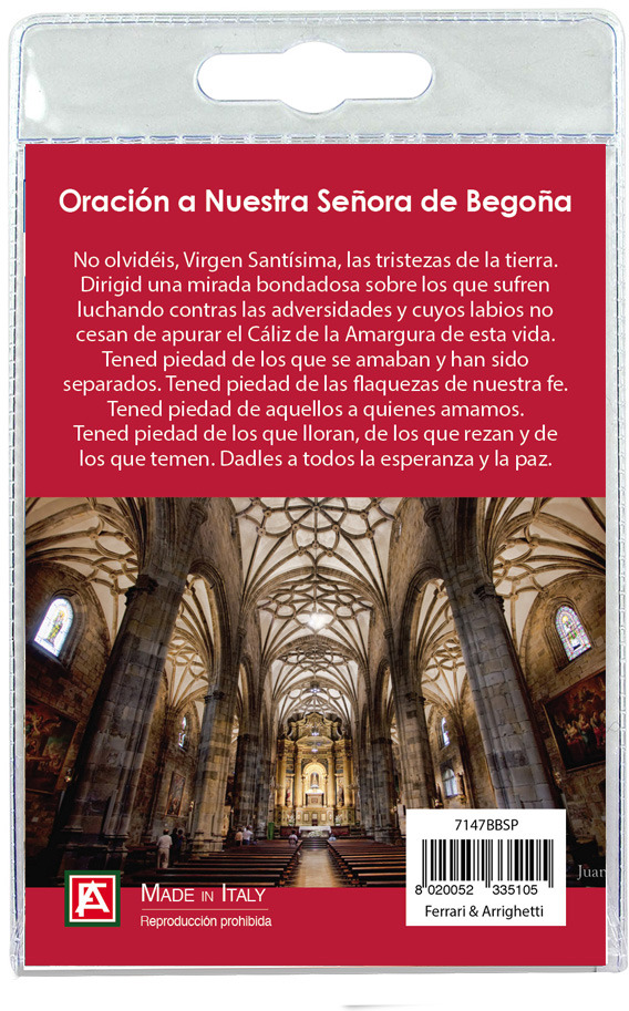Il Portachiavi si presenta confezionata in un blister con all'interno un cartoncino con immagine della Cattedrale di Begona e con una preghiera in spagnolo sul retro del cartoncino stesso.