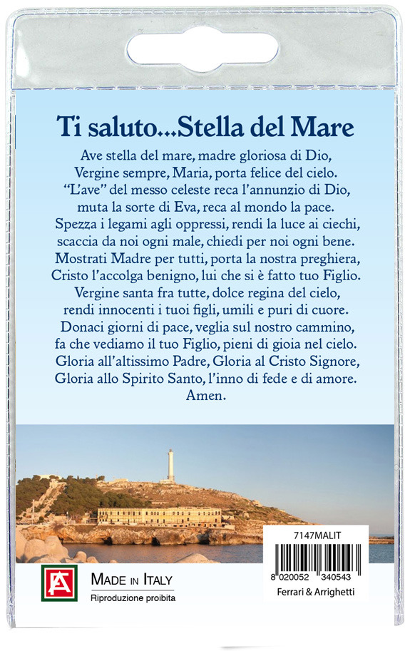 Il blister si presenta con all'interno un cartoncino, rappresentante la Madonna di S. Maria di Leuca.