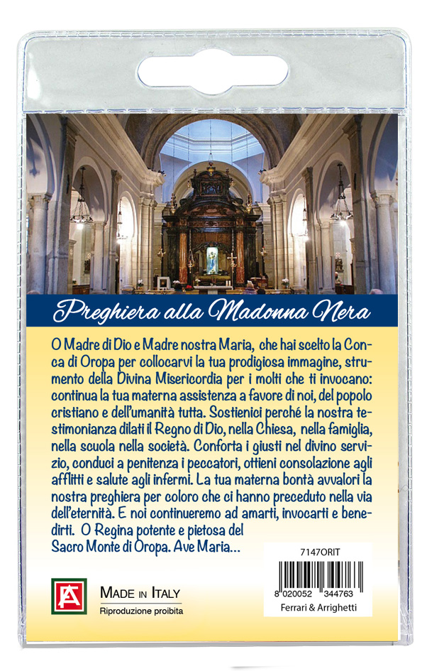 Sul retro del cartoncino vi è stampata una preghiera dedicata a Santuario di Oropa.