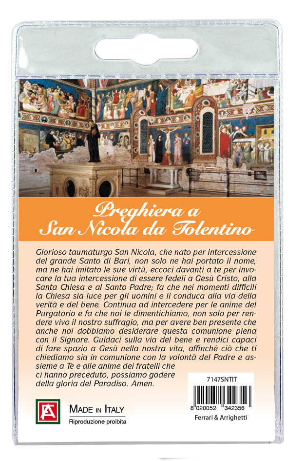 Il blister si presenta con all'interno un cartoncino, rappresentante San Nicola da Tolentino.