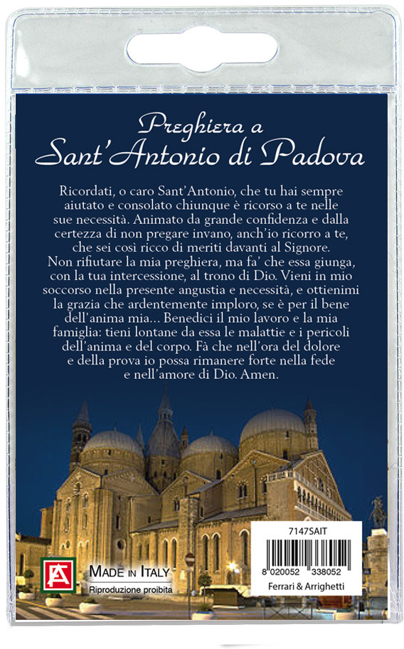 Il blister si presenta con all'interno un cartoncino, rappresentante Sant'Antonio.