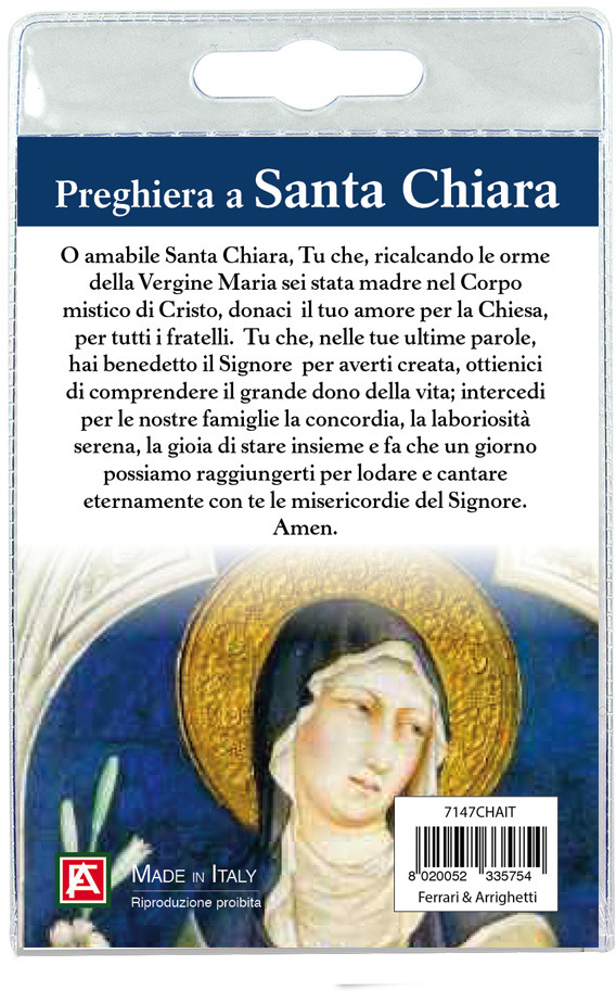 Il blister si presenta con all'interno un cartoncino, rappresentante Santa Chiara.