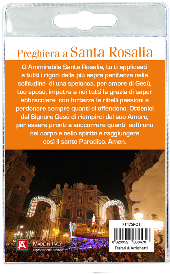Il blister si presenta con all'interno un cartoncino, rappresentante Santa Rosalia.