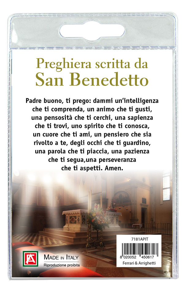 Realizzato in Italia viene consegnato in una bustina in plastica trasparente con all'interno una preghiera scritta da San Benedetto,stampata su un cartoncino raffigurante il Santo ed un immagine dell'Abbazia di Praglia (monastero benedettino).