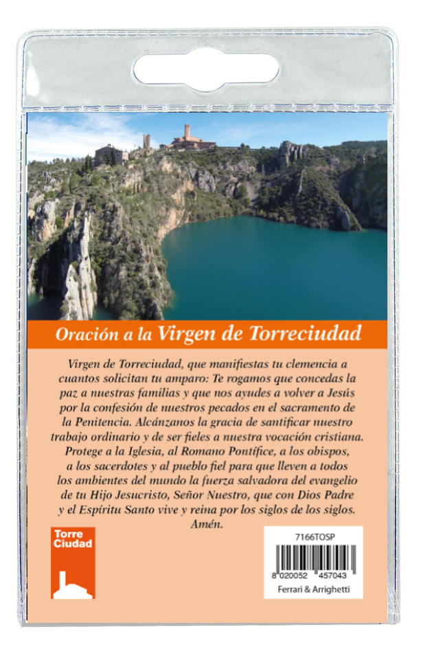 Realizzato in Italia viene consegnato in una bustina in plastica trasparente con all'interno una preghiera,in spagnolo, dedicata alla Vergine di Torreciudad.