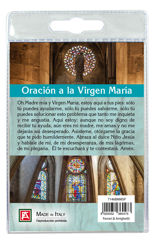 Il Portachiavi è confezionato in un blister con all'interno l'immagine della Basilica sul cui retro è stampata una preghiera dedicata alla Vergine Maria *(in spagnolo).