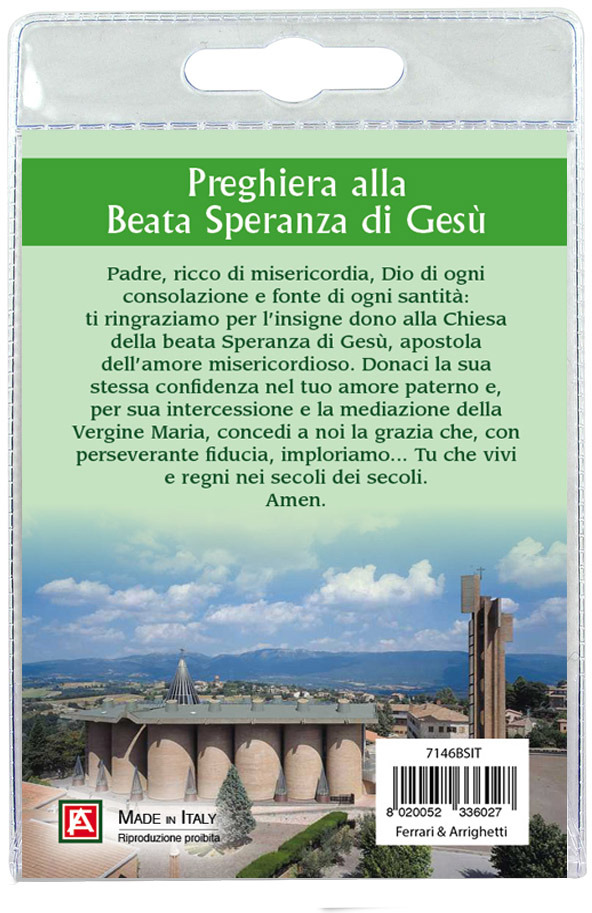 Il Portachiavi è confezionato in un blister con all'interno un immagine del santuario sul cui retro e' stampata una preghiera.