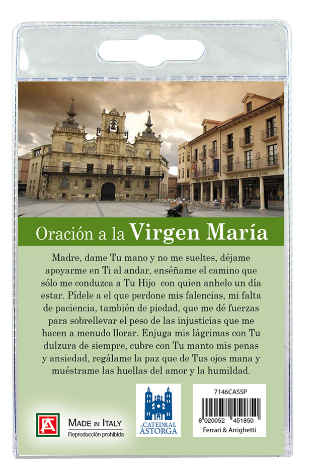 Il Portachiavi è confezionato in un blister con all'interno un immagine della Basilica sul cui retro e' stampata una preghiera in spagnolo.